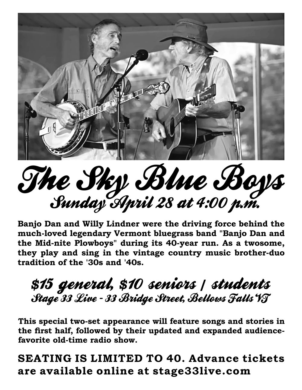 Stage 33 Live is pleased to host them for this rare southern Vermont appearance on Sunday, April 28. Doors open at 3:00, show starts at 4:00. Only 40 seats are available. Advance tickets double as chair reservations and are only available online until the day before the show — $15 general, or $10 for seniors and students. Tickets will also be available at the door on the day of show, although if the chairs have all been reserved it will be for standing room. You may bring your own seating.