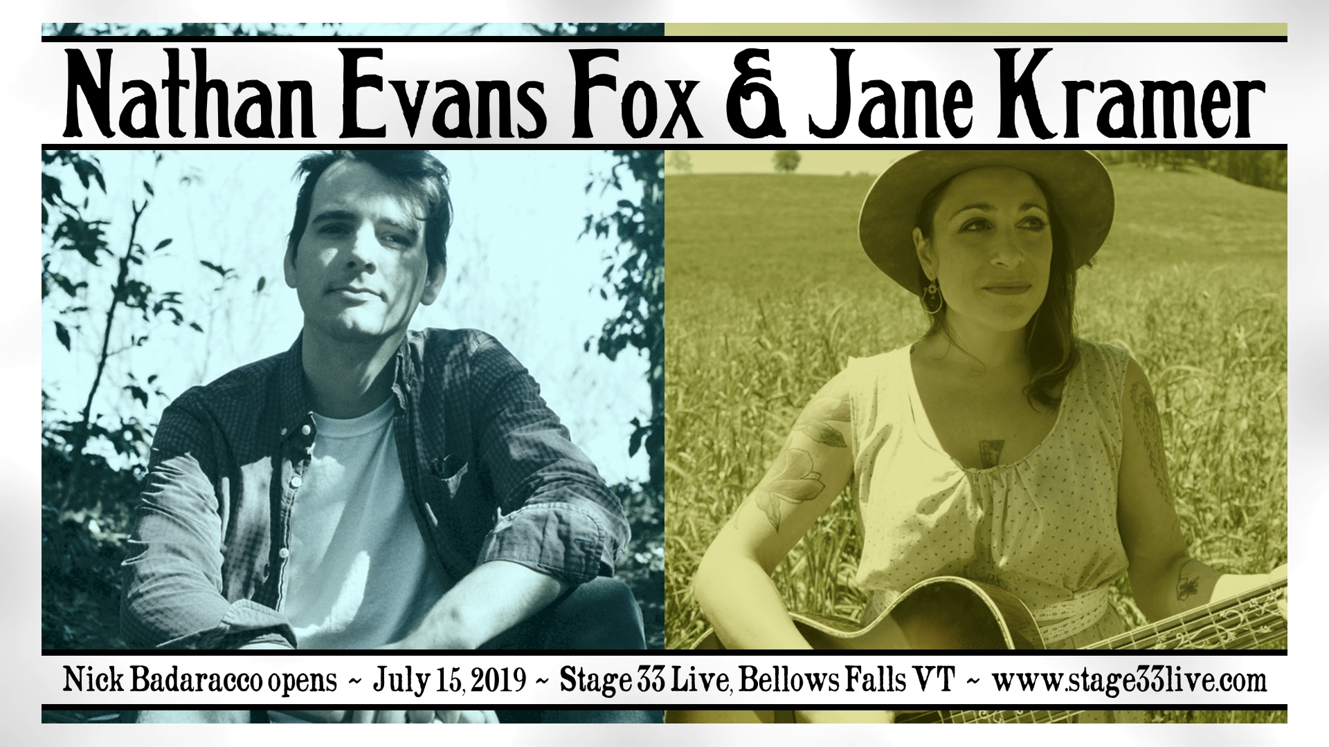 On tour from Georgia and North Carolina, Nathan Evans Fox and Jane Kramer will co-headline Stage 33 Live, playing both separately and together. Local up-and-comer Nick Badaracco opens. This early evening listening event is on Monday, July 15 at 33 Bridge Street in Bellows Falls — door at 6:00 PM, music at 7:00. A suggested donation of $10 goes entirely to the performers.