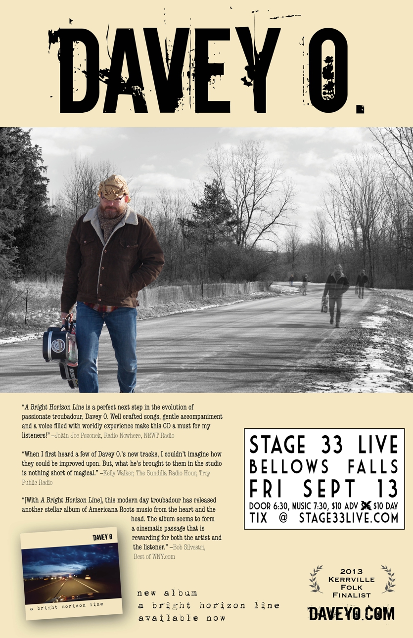 Davey O. is a seasoned touring performer whose pure Americana is drawn from a deep well of experience and human emotion without hackneyed storylines or insincere polish — an unflinching poet’s look at life with no apologies and a rust-belt work ethic. He has been a New Folk Finalist at The Kerrville Folk Festival, an Official Showcase Selection at the Folk Alliance Conference, and shared stages with the likes of Ellis Paul, Eilen Jewell, Suzanne Vega, Cheryl Wheeler, Sloan Wainwright, and The Kennedys.