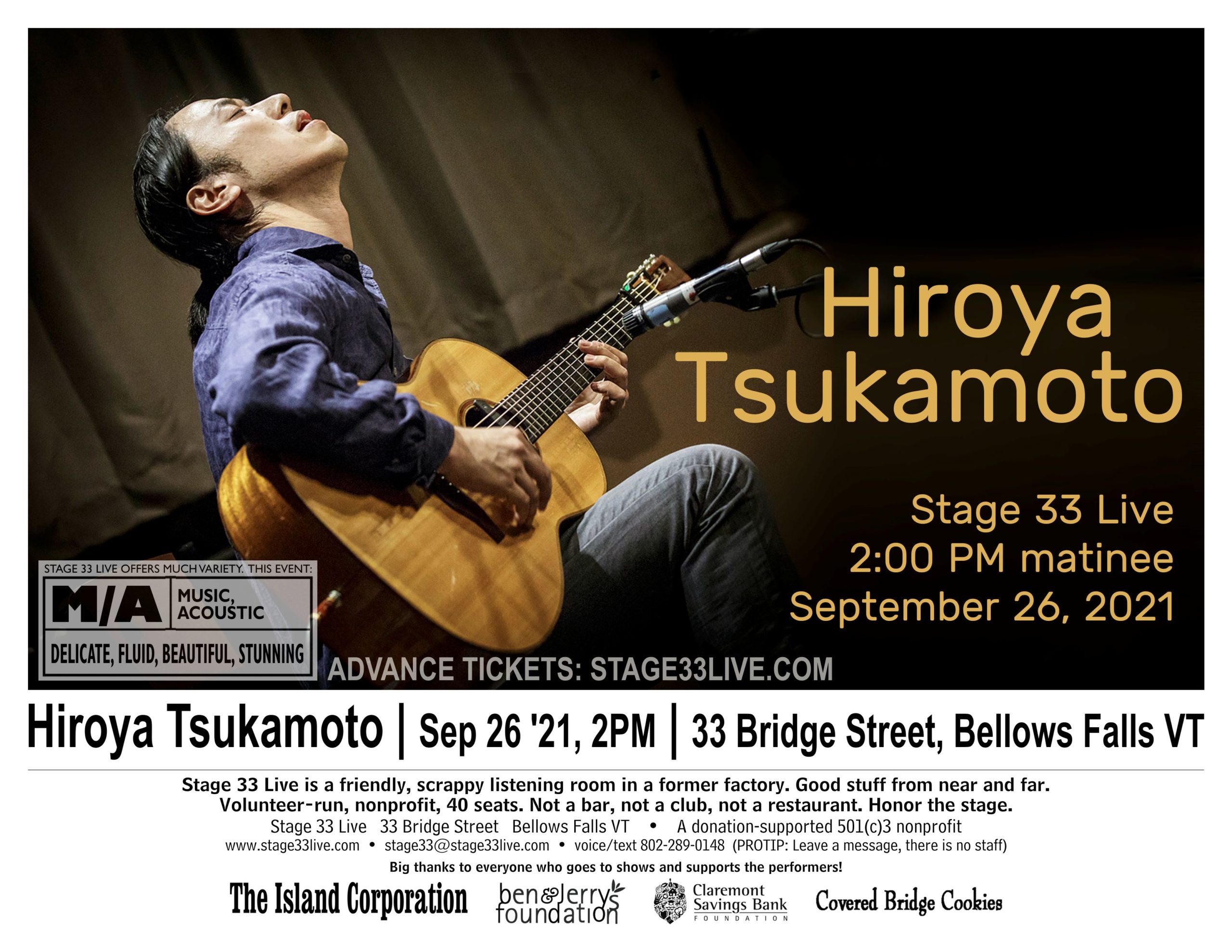 BELLOWS FALLS — Innovative guitarist and composer Hiroya Tsukamoto will bring his fusion of folk, jazz, and world music back to Stage 33 Live, 33 Bridge Street in Bellows Falls on September 26 for a special matinee performance.