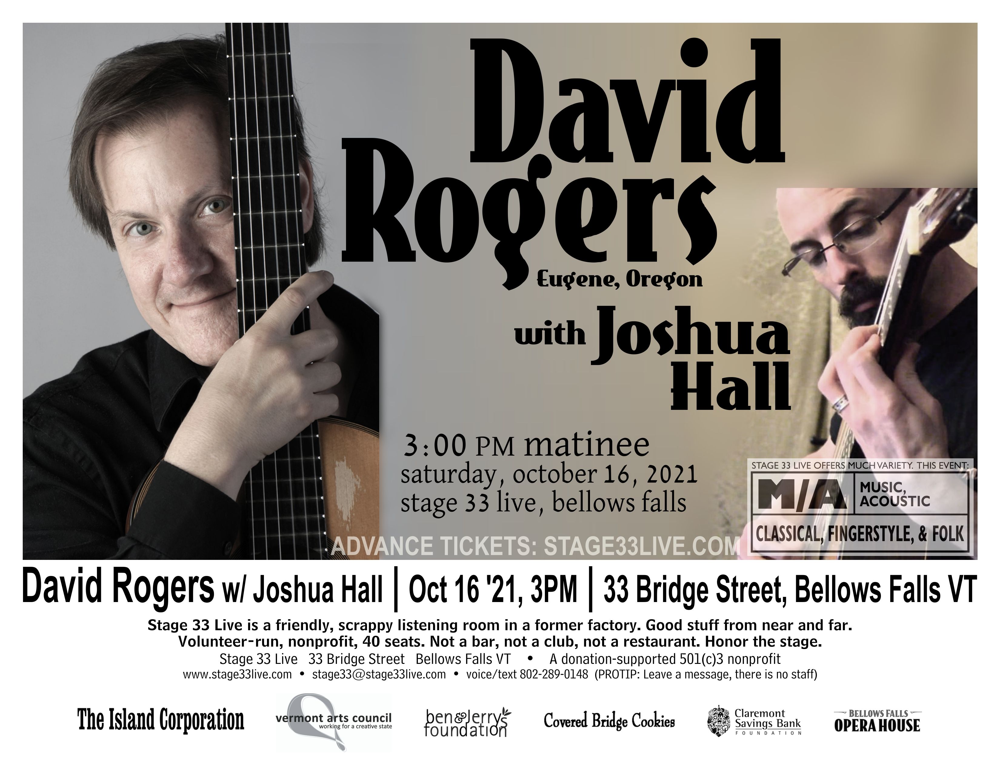 “A prominent guitarist” (NYT), “astonishingly florid” (WaPo), “modern master of the classical guitar” (20th Century Guitar). David Rogers fuses classical, jazz, and world music into virtuosic performances at a special 3:00 PM matinee on Saturday, October 16 at Stage 33 Live, 33 Bridge Street in Bellows Falls. Josh Hall opens. $10 in advance, $15 at the door; limited seating; recorded and filmed. COVID-19 protocol in effect which may change without notice.