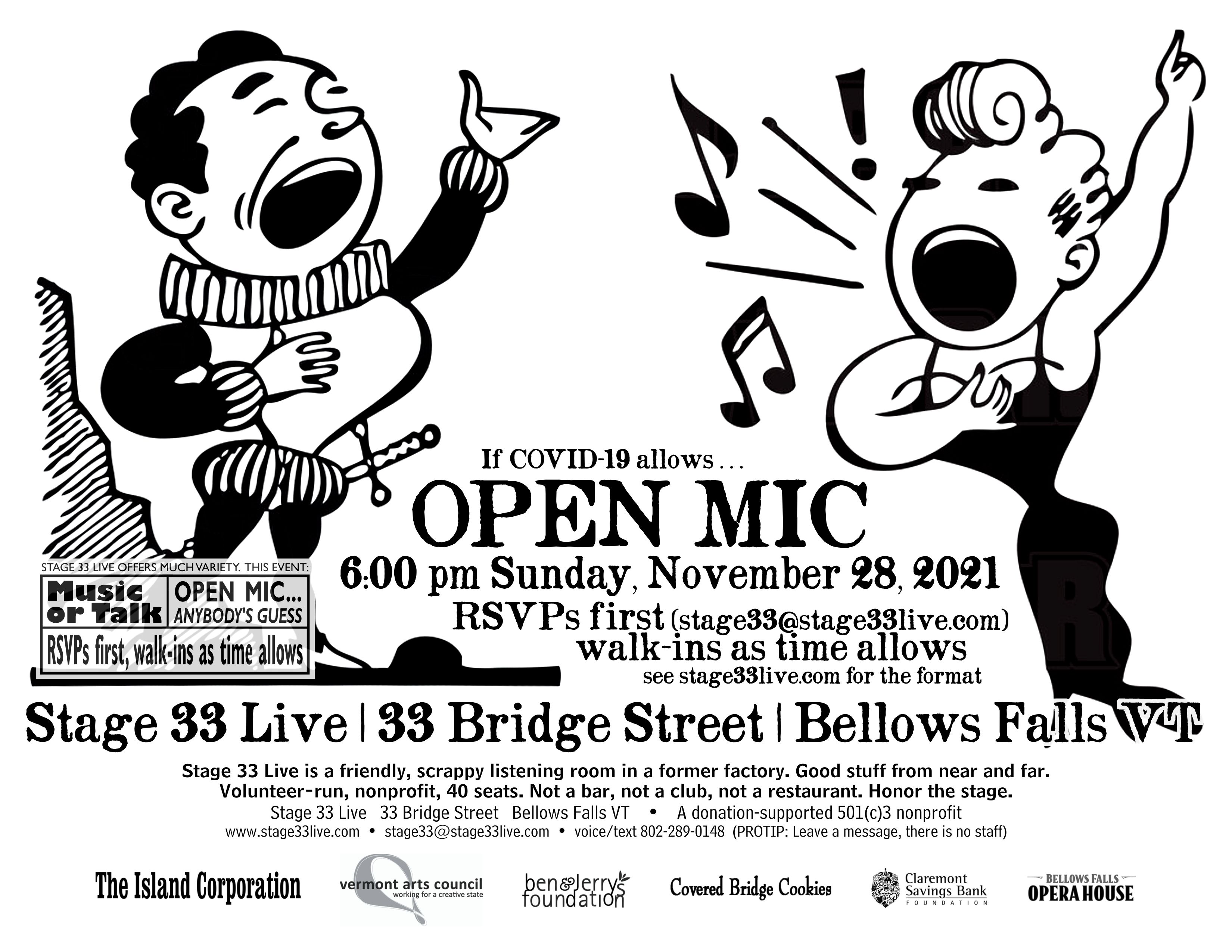 The first eight people who RSVP to stage33@stage33live.com are guaranteed 12 minutes at an open mic on November 28 starting at 6:00 PM. (If we can keep changeovers to three minutes, that’s two hours.) If there are unreserved slots, walk-ins go next. If people are into it continuing after eight slots have gone, we’ll go long… people who haven’t played first, then second slots for people who want one.