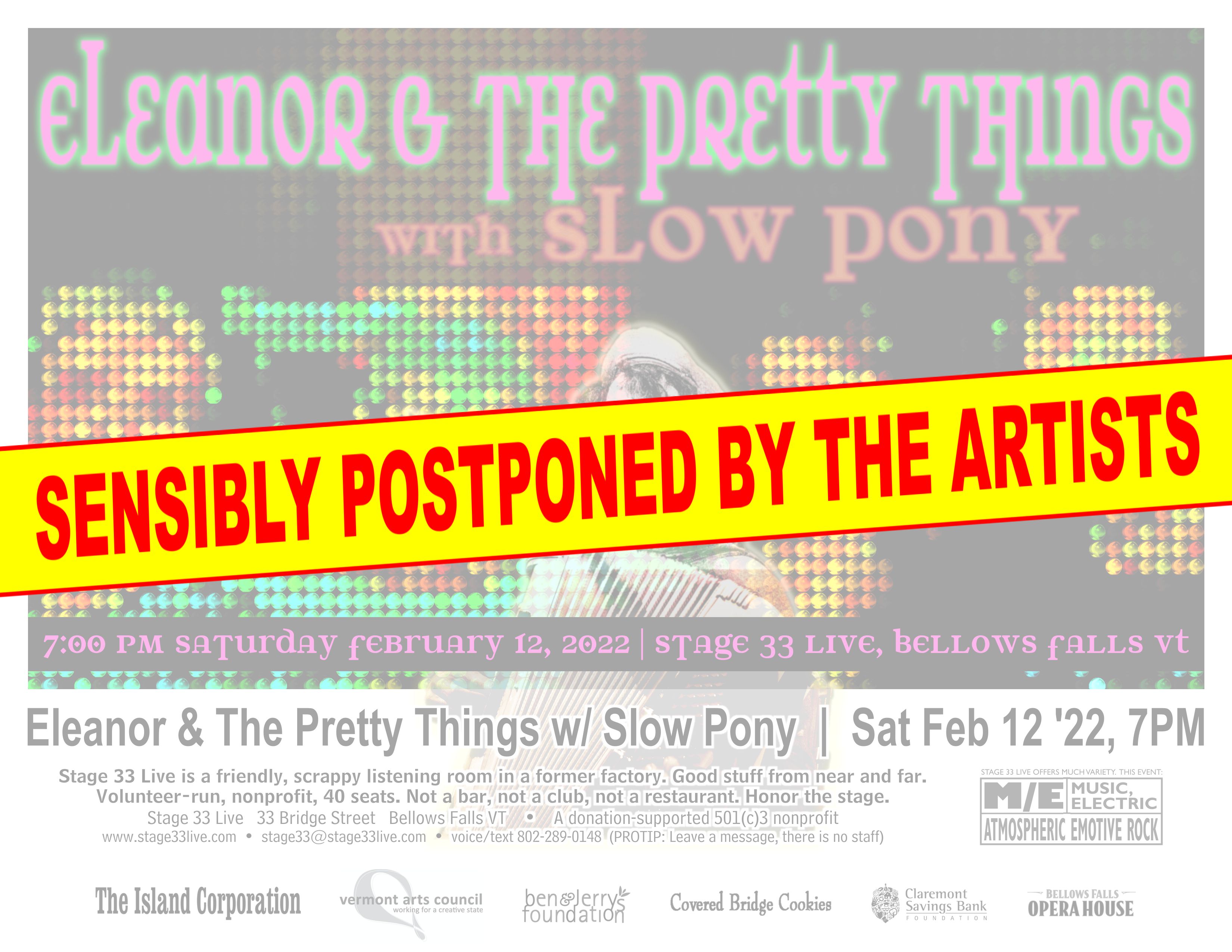 Eleanor & The Pretty Things is a dynamic alt-indie band known for live performances that range from downright shimmering to borderline screamo, always tastefully, and often within the same song. Slow Pony opens with accordion-centric music from the corners of the globe. Stage 33 Live, 33 Bridge Street, Bellows Falls VT, on Saturday, February 12 at 7:00 PM. Suggested $10 donation, more or less. Limited seating; recorded and filmed; masks required. More info at stage33live.com