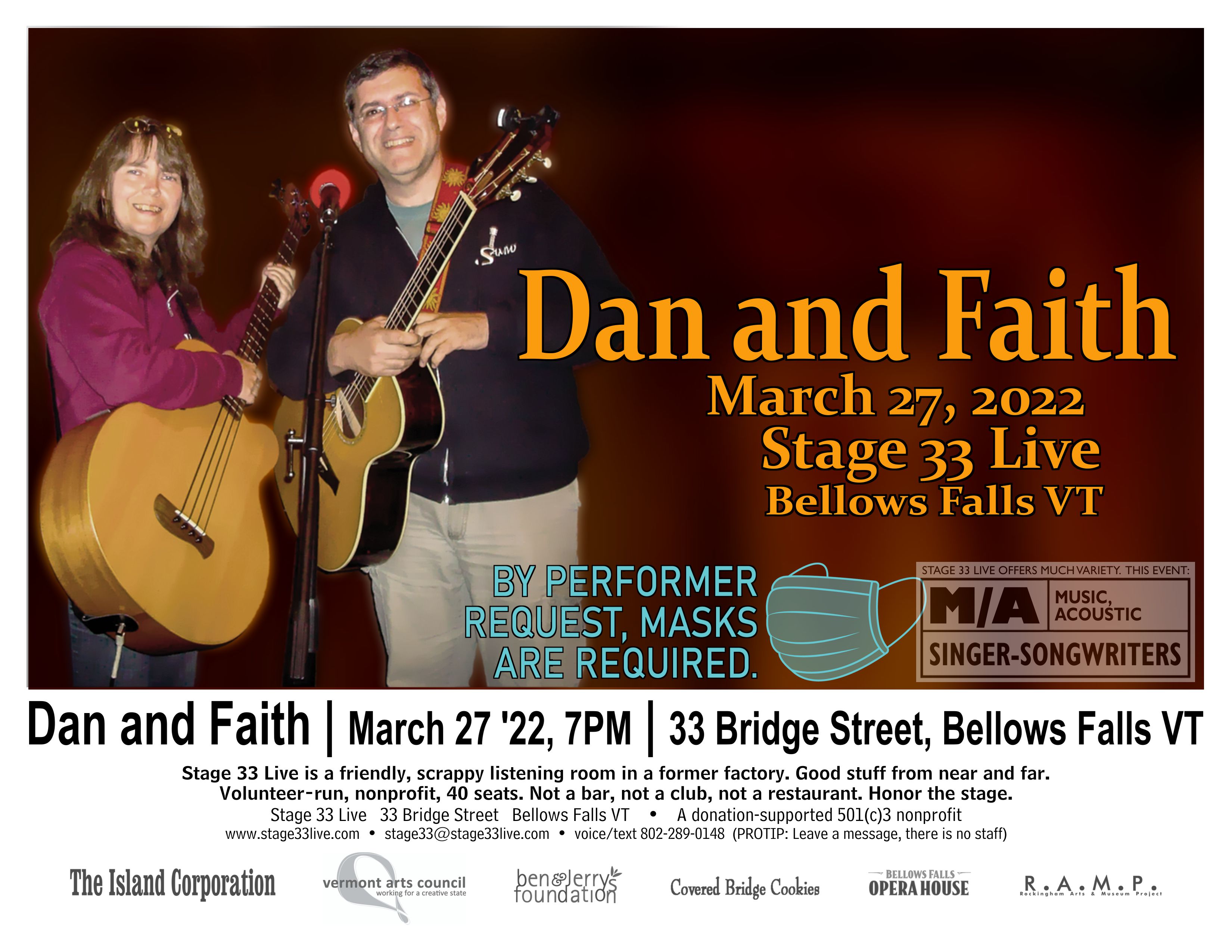 Dan and Faith will play the Stage 33 Live listening room at 33 Bridge Street in Bellows Falls, Vermont, on Sunday, March 27 at 7:00 PM. $5 recommended donation for the band. Limited seating. Masks required by performer request. The performance will be recorded and filmed. More info at the stage33live.com website.