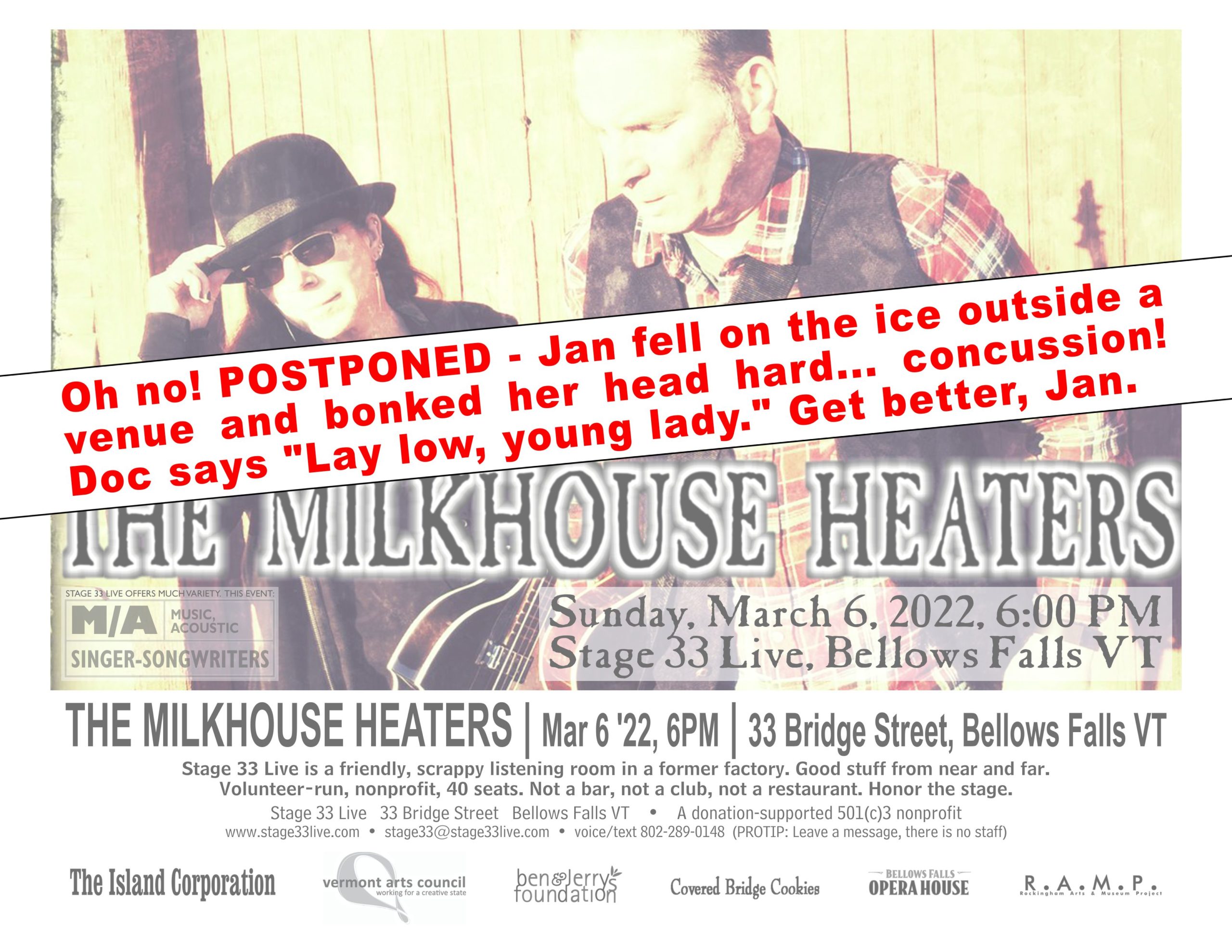 The Milkhouse Heaters will play the Stage 33 Live listening room at 33 Bridge Street in Bellows Falls, Vermont, on Sunday, March 6 at 6:00 PM. $5 recommended donation for the band. Limited seating. The performance will be recorded and filmed.