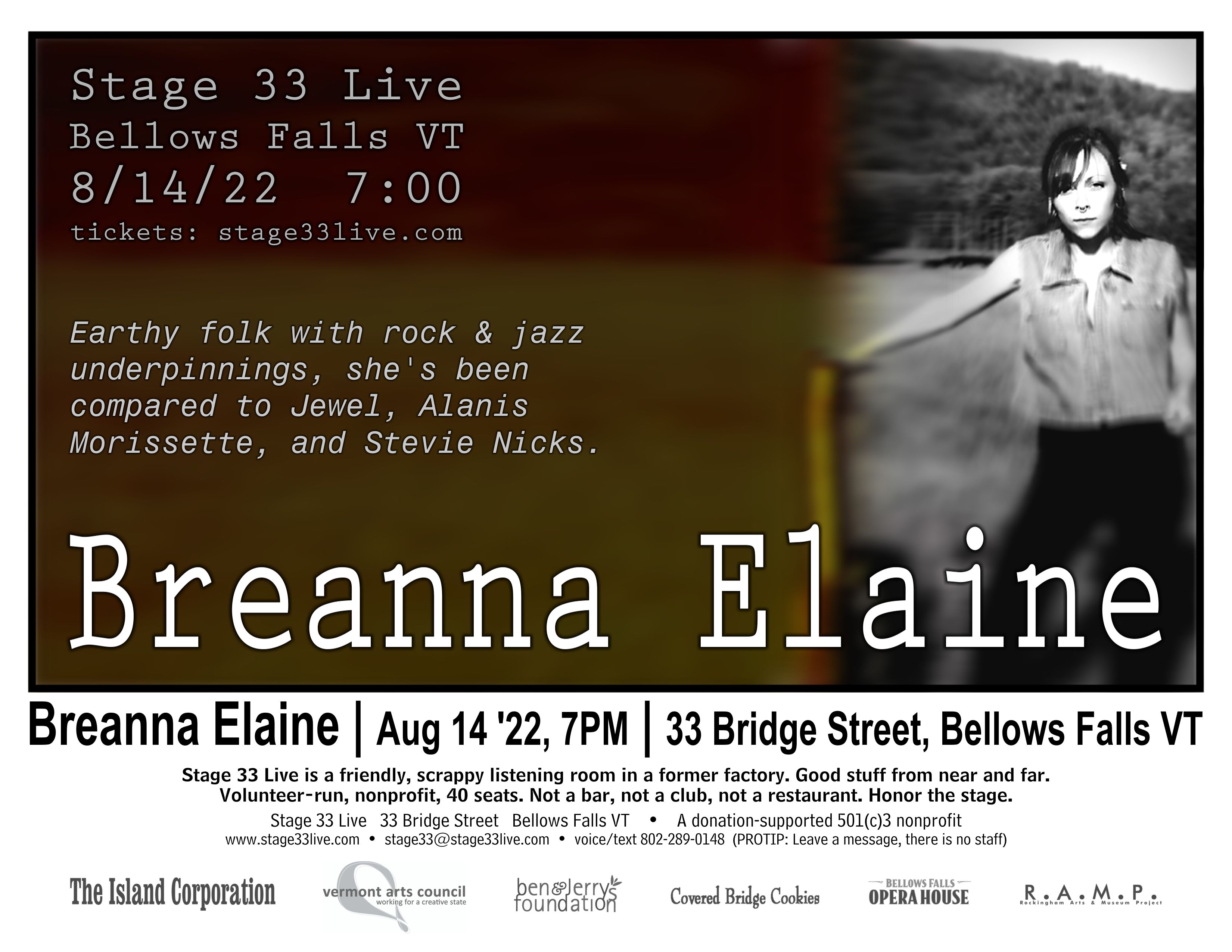 Breanna Elaine will play the Stage 33 Live listening room at 33 Bridge Street in Bellows Falls, Vermont, on Sunday, August 14 at 7:00 PM. $10 in advance, $15 at the door – all proceeds go to the performer. Limited seating. The performance will be recorded and filmed. Read the press release.