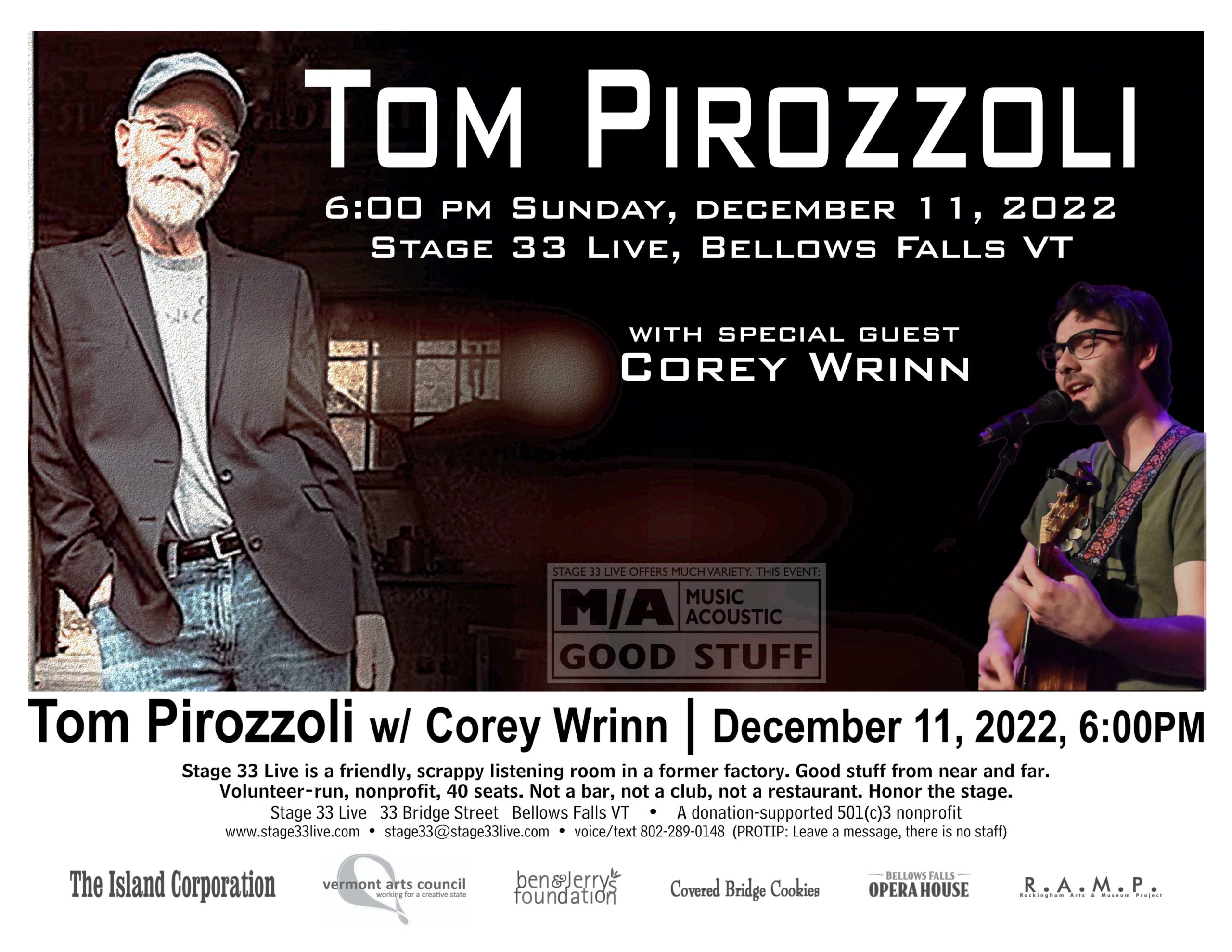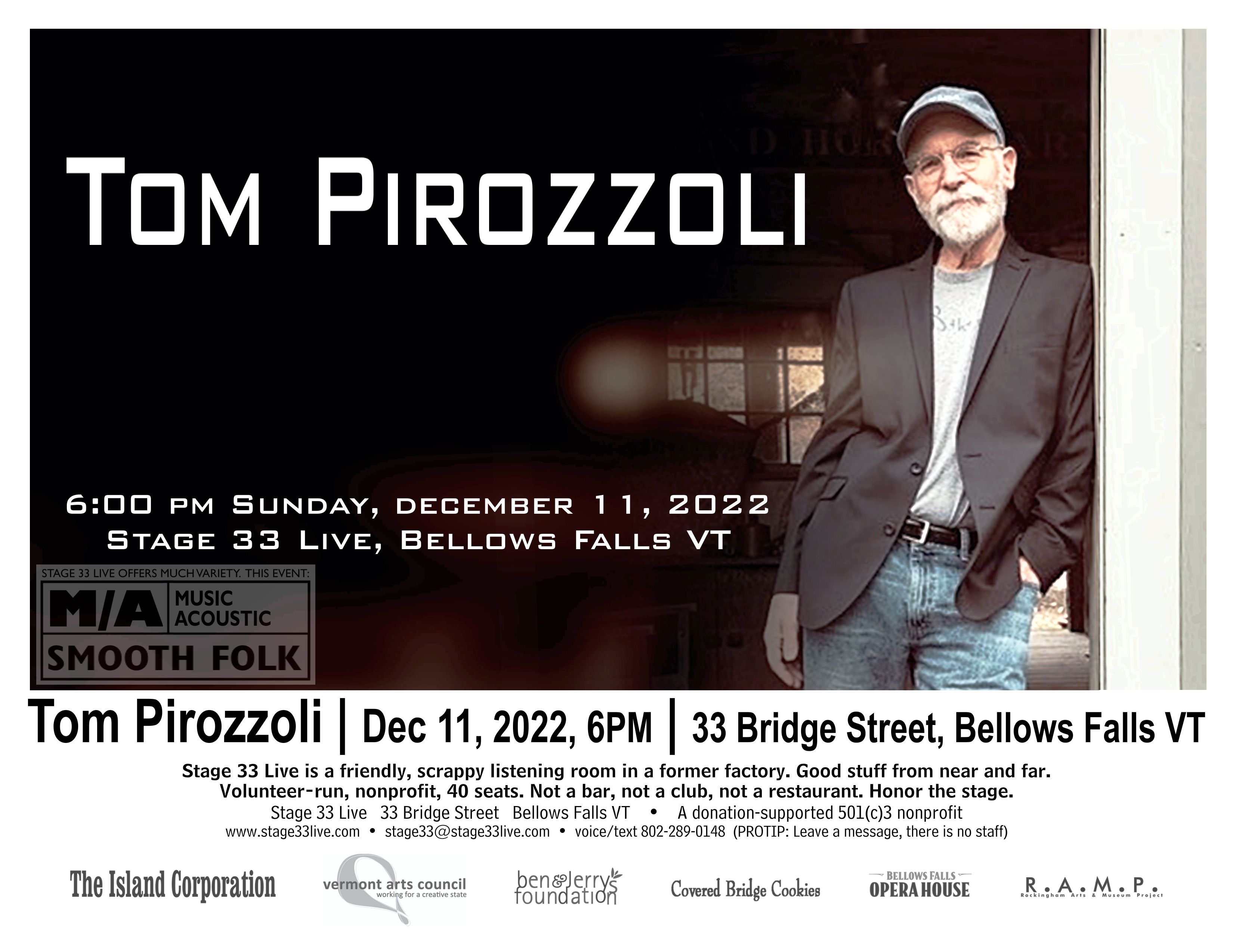 Folk musician Tom Pirozzoli returns to Stage 33 Live for a rare performance on Sunday, December 11, 2022, at 6:00 PM, 33 Bridge Street in Bellows Falls VT. Corey Wrinn will open. Limited seating; recorded and filmed. With Tom’s blessing, advance tickets are a discounted $7, and will be $10 at the door. Read the press release.