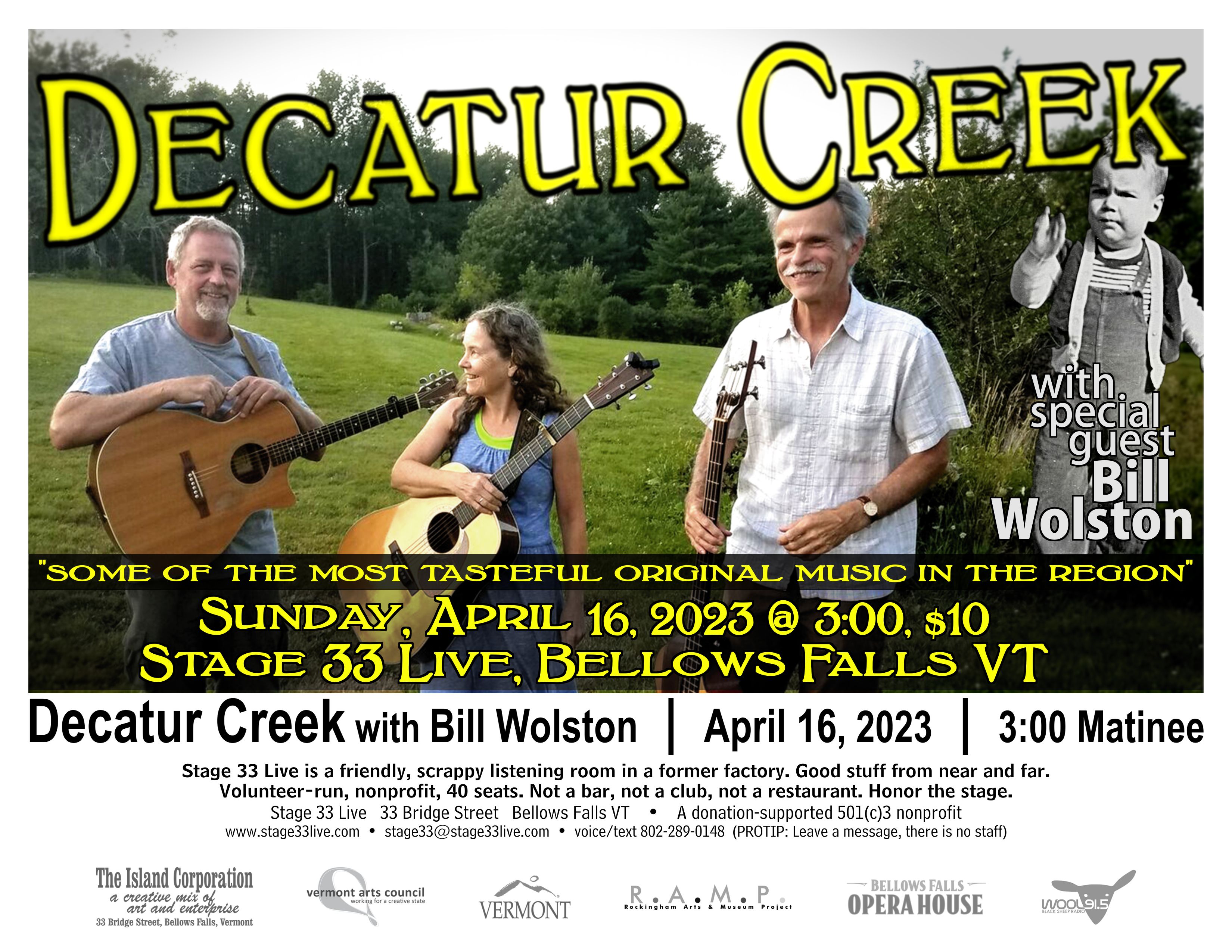 Individually accomplished performers Beth Eldridge, Doug Farrell, and Jack Henry together are Decatur Creek, writing and playing some of the most tasteful original music in the region. They will give a 3:00 matinee concert on Sunday, April 16 at Stage 33 Live, 33 Bridge Street in Bellows Falls, Vermont. Tickets are $10; advance tickets reserve a seat up front. Bill Wolston will open with songs of love, loss, pride of place, and nature. Read the press release.