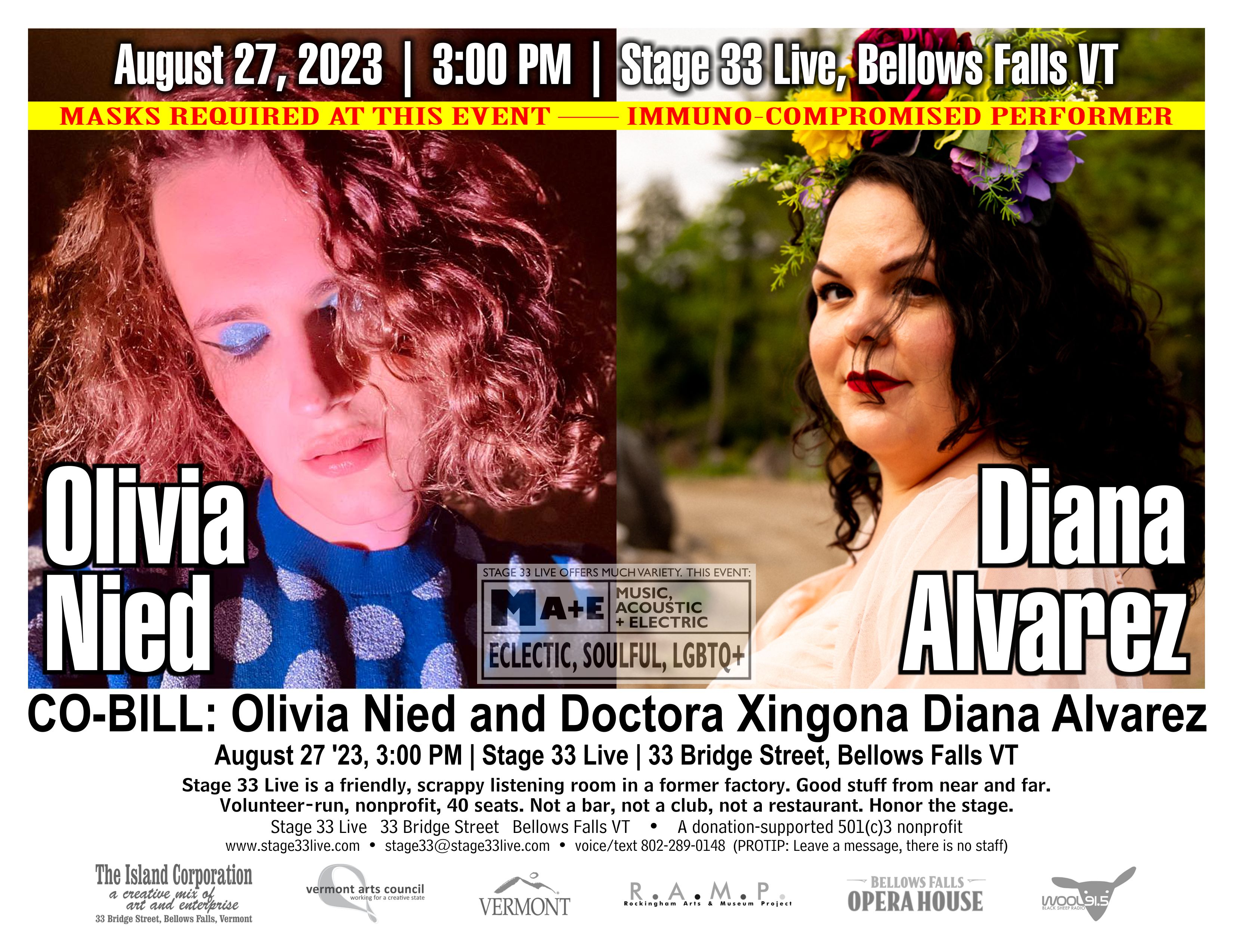 Multi-instrumentalist singer-songwriter Olivia Nied and musician-poet-performer Doctora Xingona Diana Alvarez will co-headline a 3:00 matinee at Stage 33 Live, 33 Bridge Street in Bellows Falls VT on Sunday, August 27, 2023. LGBTQIA+ and allies friendly. Masks are required at this event — one of the performers is immuno-compromised. The venue will have disposable masks available. Tickets are $10 in advance or $15 at the door. Limited seating; the event will be recorded and filmed. Read the press release.