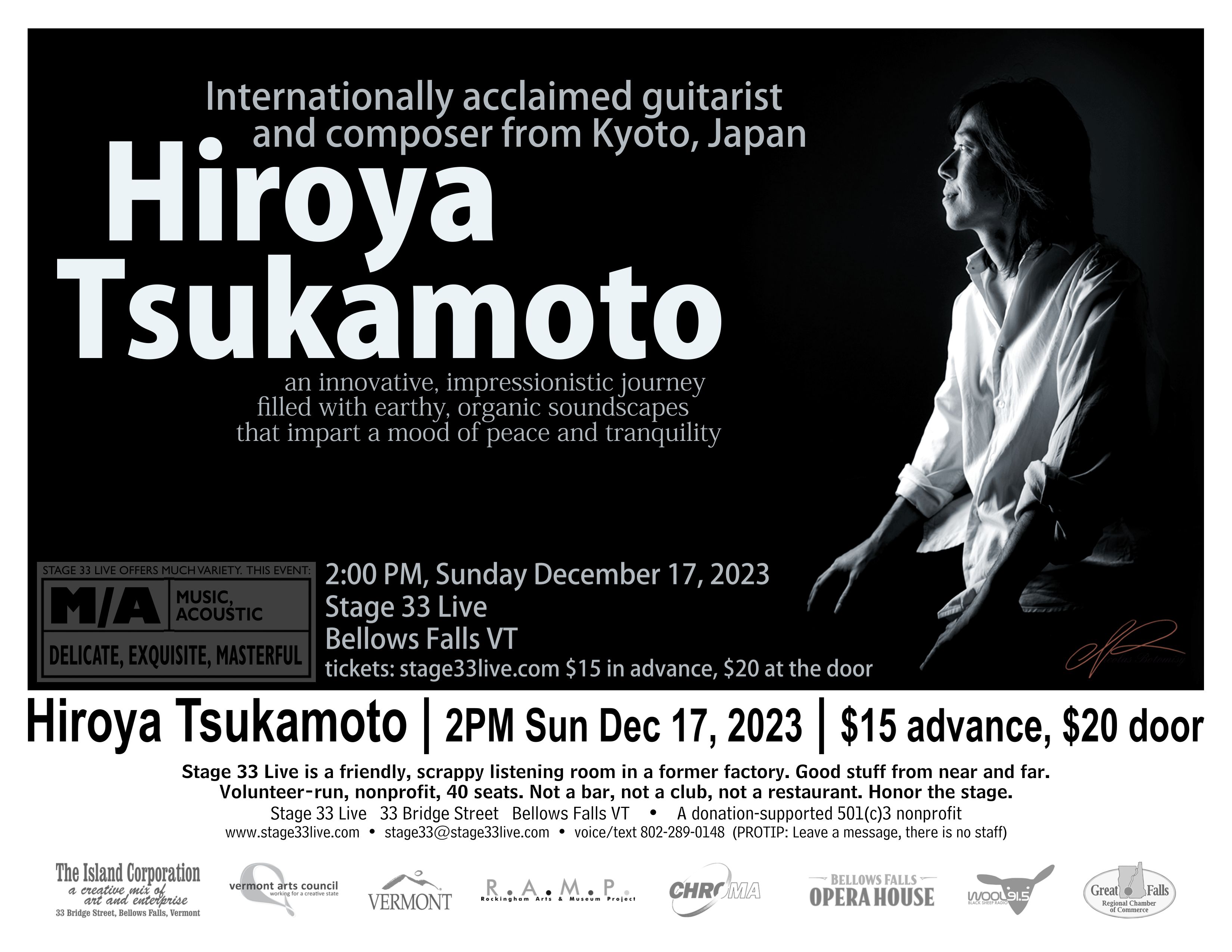 BELLOWS FALLS — Stage 33 Live welcomes Hiroya Tsukamoto back to the room for the first time since 2021 in a 2:00 matinee on December 17, 2023. Tickets are a discounted $15 in advance through stage33live.com or $20 at the door.