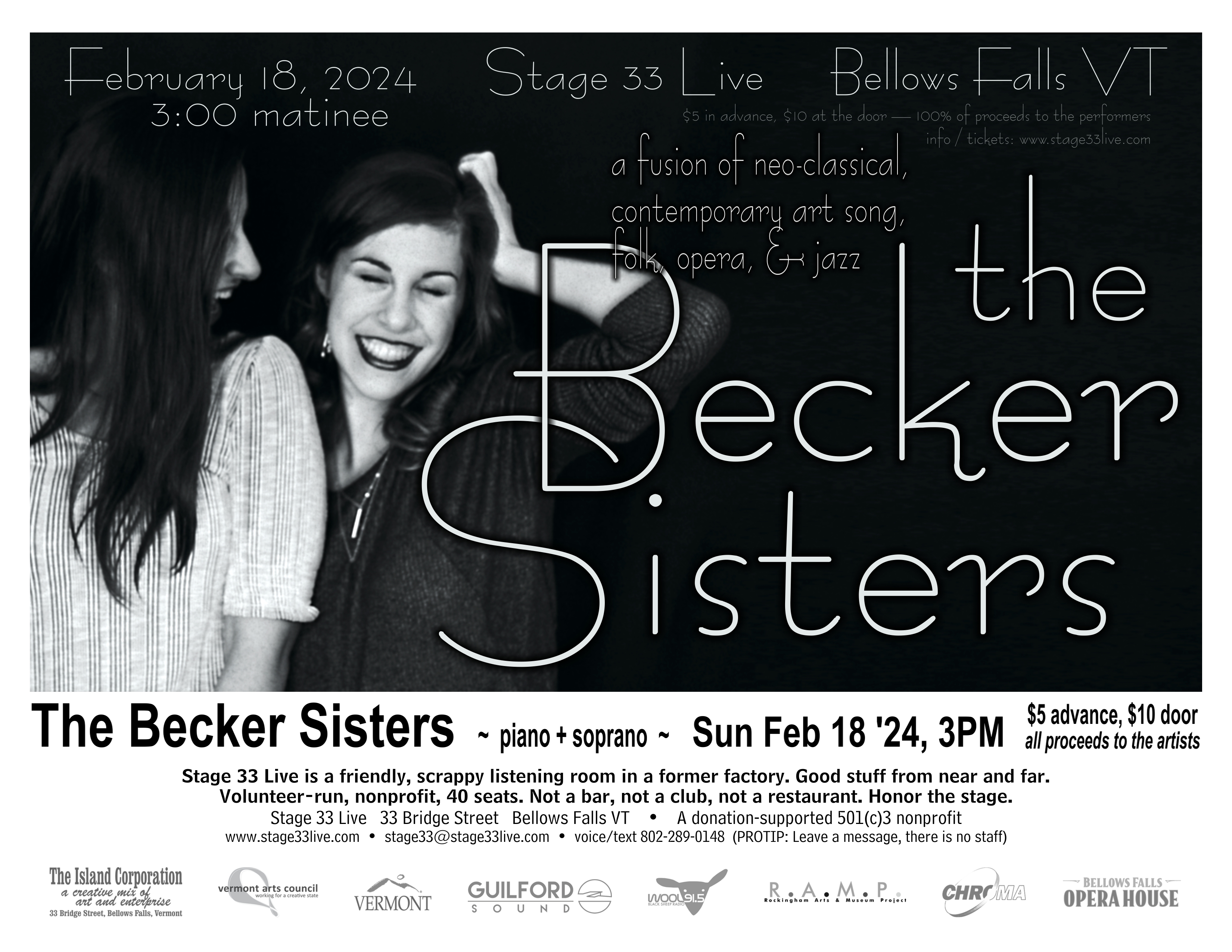 The Becker Sisters are a soprano / piano duo fusing neo-classical, contemporary art song, folk, opera, and jazz. They will perform at Stage 33 Live on Sunday, February 18, 2024, in a 3:00 matinee. Tickets are $5 in advance or $10 at the door; all proceeds go to the artists. Limited seating; the event will be recorded and filmed. Read the press release.