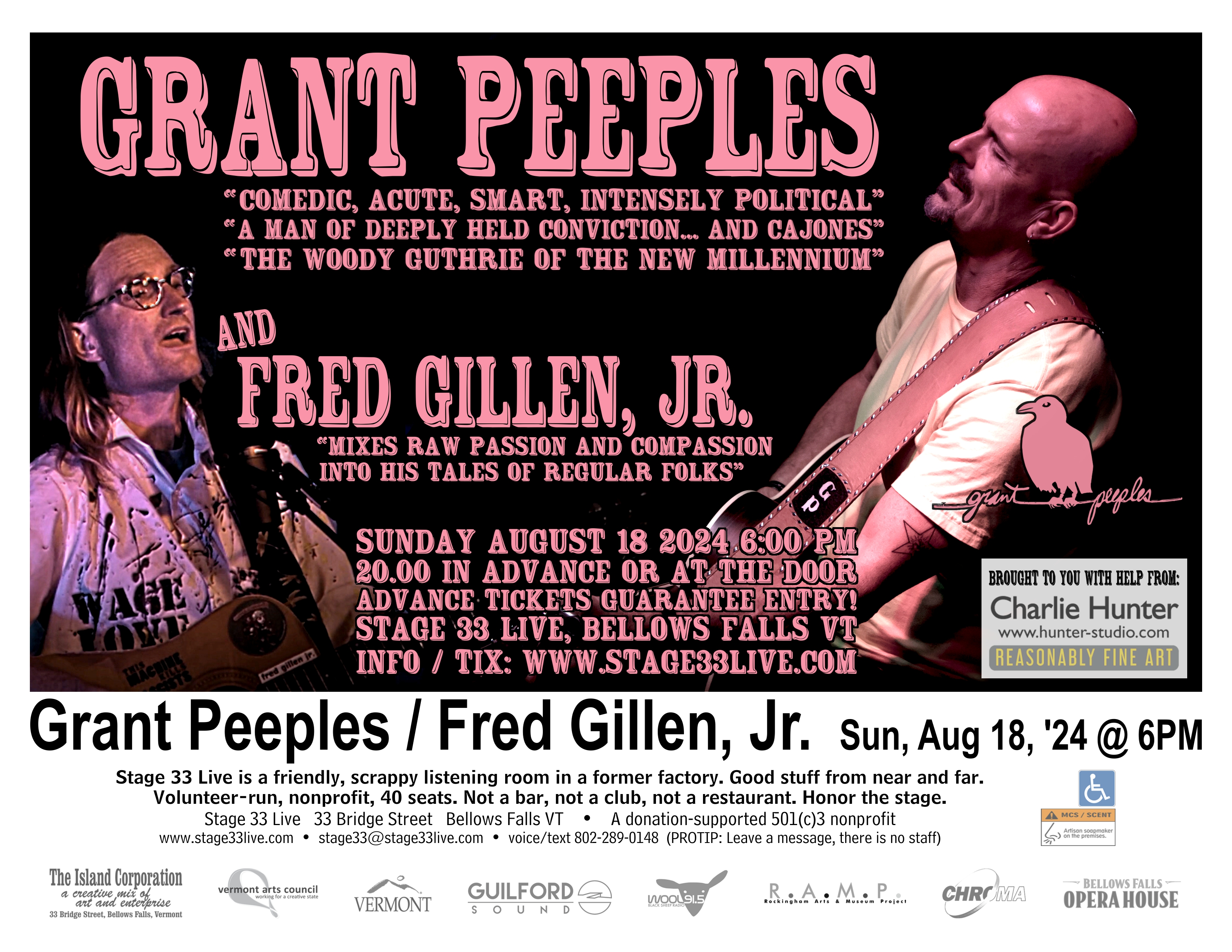 Darkly hilarious and dead serious singer-songwriter Grant Peeples and globetrotting, truth-telling troubadour Fred Gillen Jr will co-headline Stage 33 Live, 33 Bridge Street in Bellows Falls, Vermont, on August 18, 2024, at 6:00 PM. Tickets are $20 in advance through stage33live.com or at the door. Advance tickets guarantee entry. Seating is limited! The event will be recorded and filmed. Read the press release.