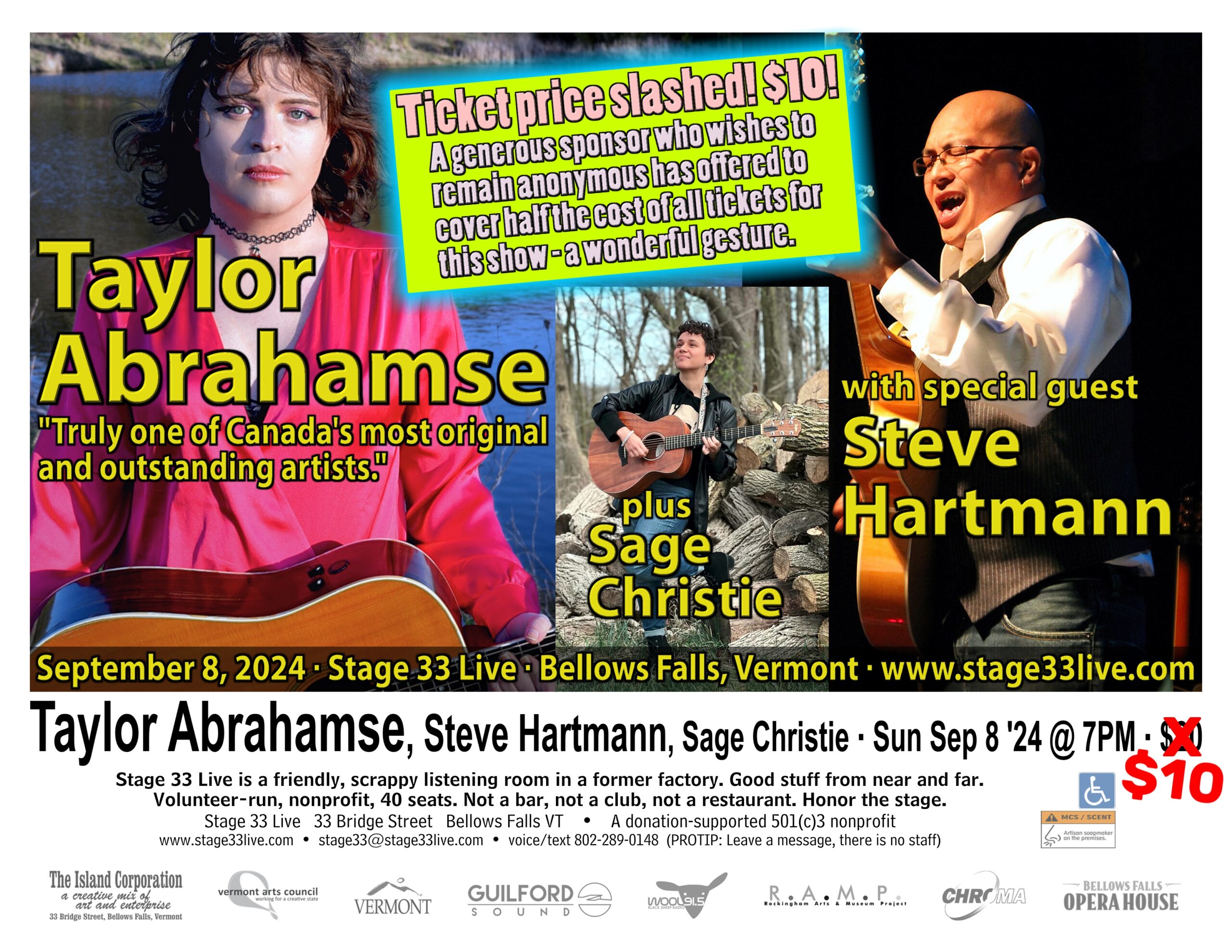 BELLOWS FALLS — Stage 33 Live’s performance season begins with three solid songwriters with stunning voices: Taylor Abrahamse from Ontario, plus special guest Steve Hartmann, and Asheville-based Sage Christie opening at 33 Bridge Street in Bellows Falls, Vermont, on Sunday, September 8, 2024, at 7:00 PM. $20 $10! in advance through stage33live.com or at the door until sold out. Advance tickets guarantee entry. Only 40 tickets will be sold. The performances will be recorded and filmed.