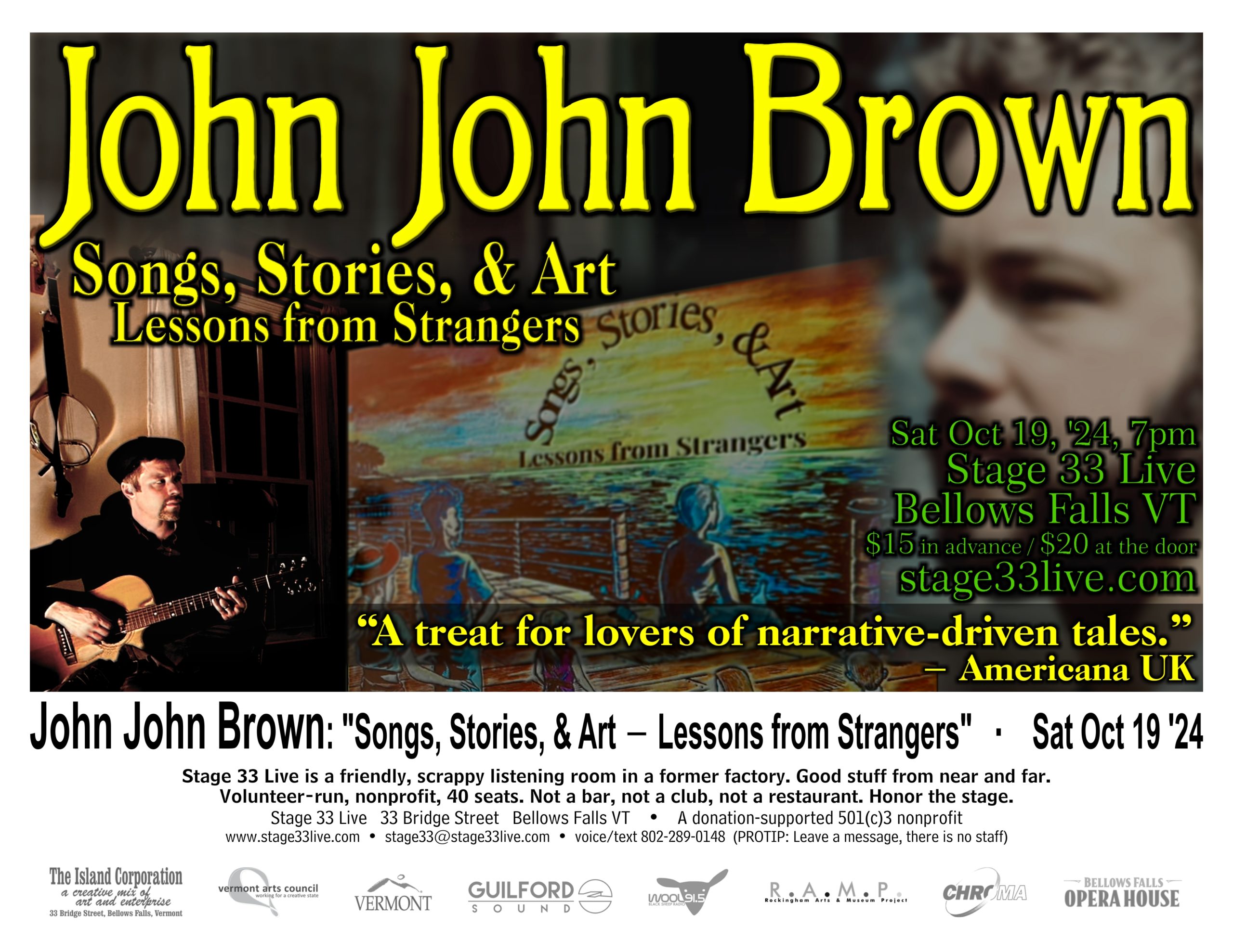 John John Brown’s “Songs, Stories, & Art — Lessons from Strangers” weaves storytelling songs and visual arts together in live performance. Stage 33 Live, 33 Bridge Street in Bellows Falls, VT, on Saturday, October 19, 2024, at 7:00 PM. Tickets are $15 in advance through stage33live.com or $20 at the door. Limited seating; recorded and filmed. More info and tickets at stage33live.com