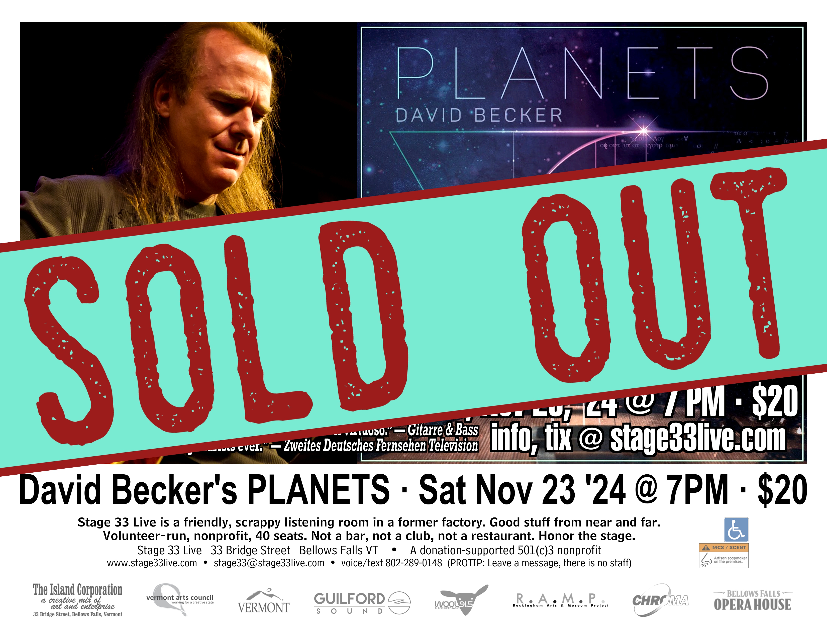 Stage 33 Live gratefully acknowledges the help of so many individuals without whom none of this would be able to happen, and institutional support this season from The Island Corporation, the Vermont Arts Council, Guilford Sound, WOOL-FM, the Rockingham Arts & Museum Project, and Chroma Technologies to help fund improvements and maintenance, and generally smooth out a lot of the rough edges. Stage 33 Live is a 501(c)3 nonprofit organization, and all donations are deductible to the fullest extent. Volunteers run the thing from stem to stern.
