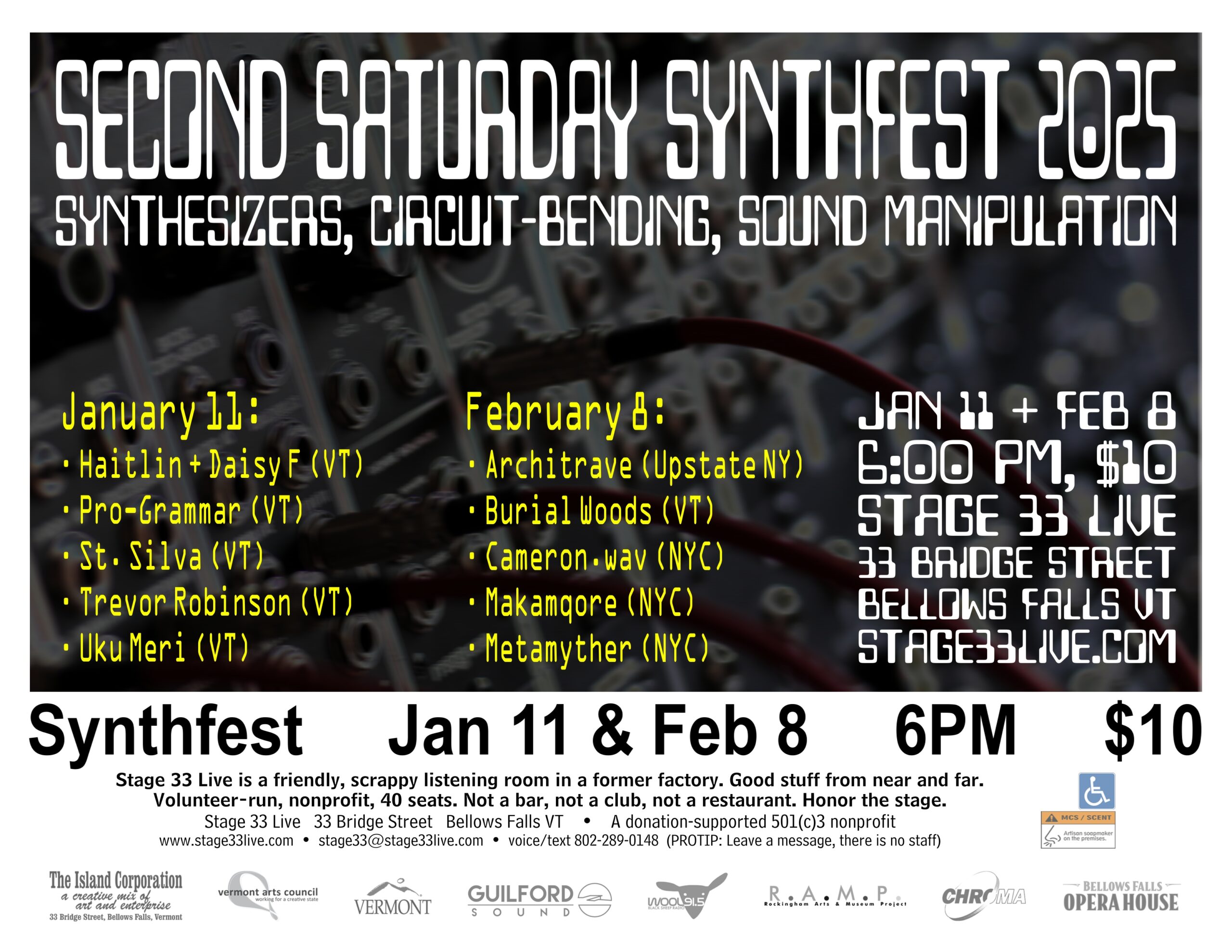 The Second-Saturday Synthfests at Stage 33 Live celebrate synthesizer performance, circuit-bending, and sound manipulation on Saturday, January 11 and Saturday, February 8 at 33 Bridge Street in Bellows Falls, Vermont. Gear Q&A at 6:00, performers at 7:00. $10 suggested donation for the performers. The performances will be recorded and filmed. Read the press release.