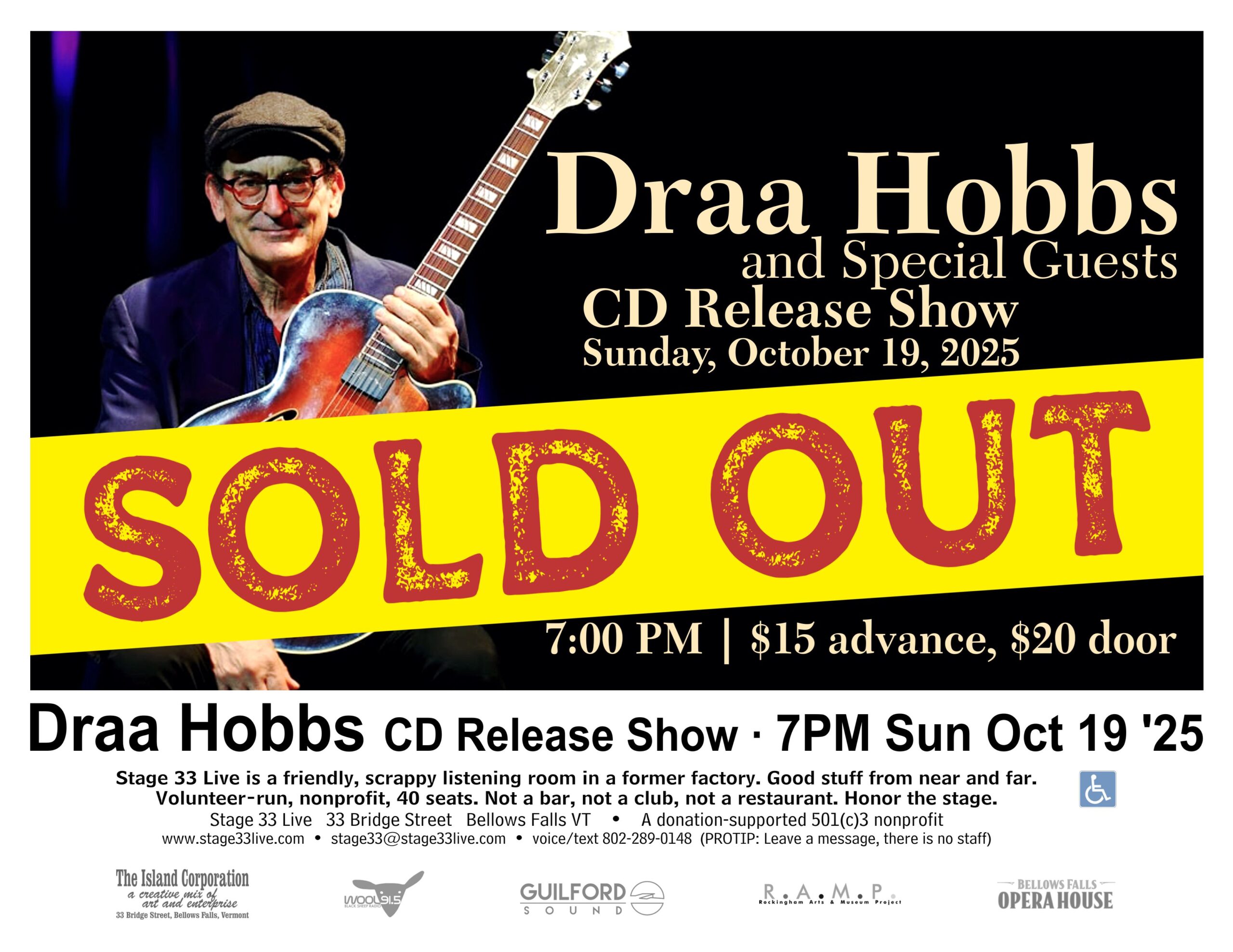 Jazz guitarist Draa Hobbs celebrates the release of his new album with a concert at Stage 33 Live in Bellows Falls, Vermont, on October 19, 2025 at 7:00 pm. He’ll be backed by bringing tenor sax virtuoso Michael Zsoldos, Berklee College of Music’s Rich Greenblatt on vibes, Hartford bassist Steve Bulmer, and extraordinary drummer Tim Gilmore, plus Sarah Clay on flute for select numbers. Tickets are a discounted $15 in advance through stage33live.com, or $20 at the door as available. Advance tickets guarantee entry. Only 40 tickets will be sold. Read the press release.