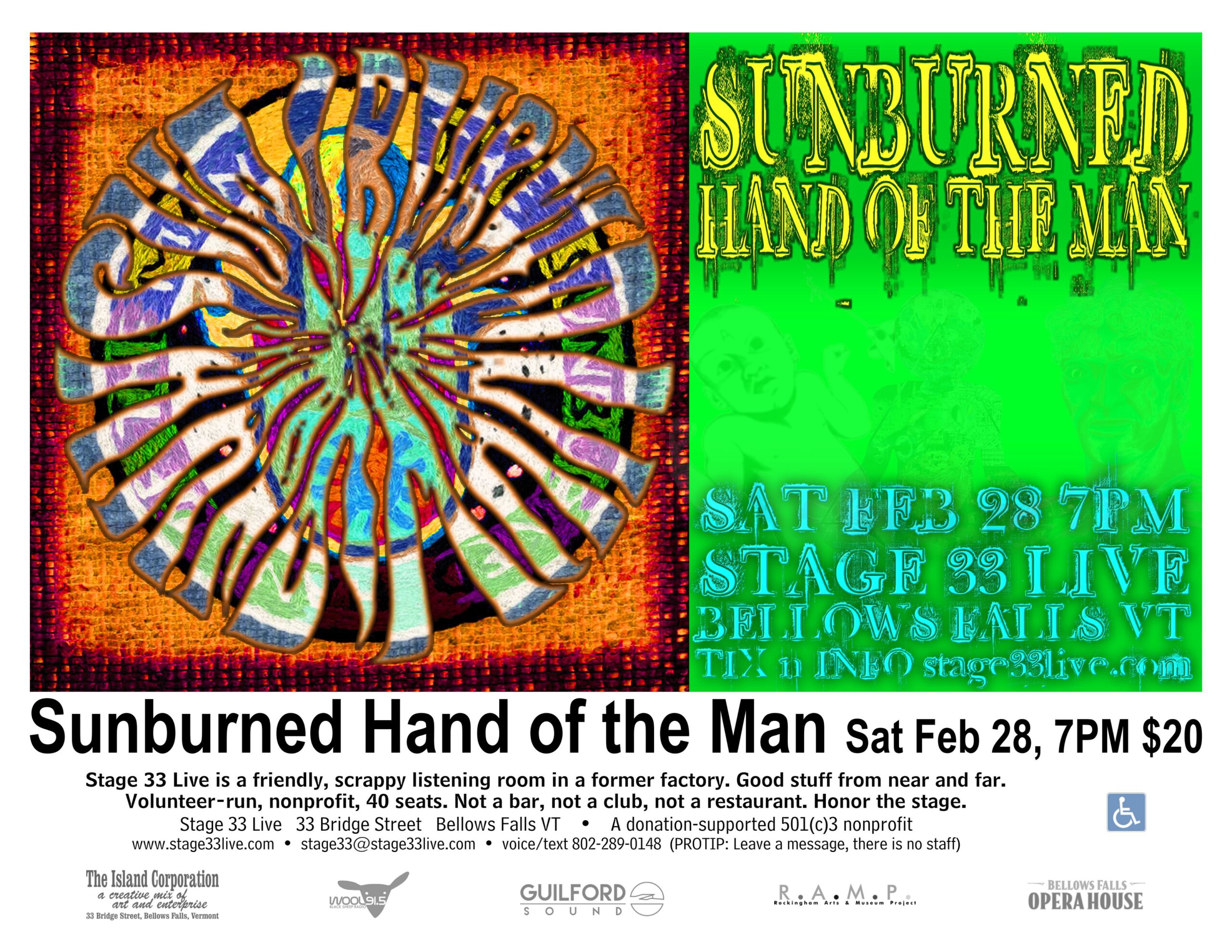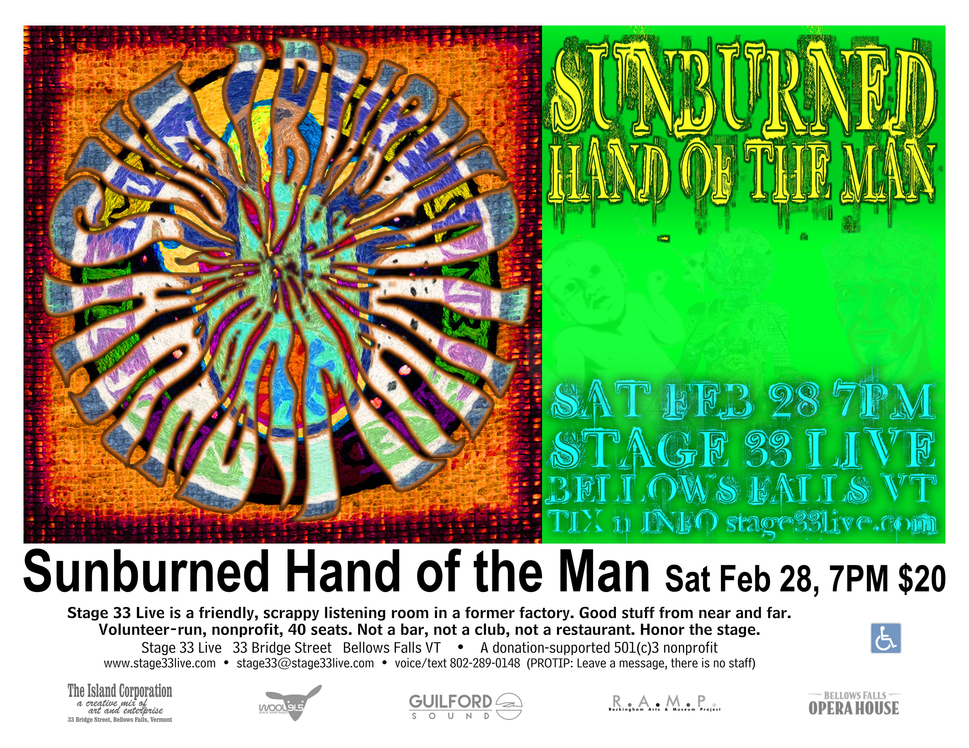 The enigmatic experimental collective Sunburned Hand of the Man will play Stage 33 Live on Saturday, February 28, 2026, at 7:00 PM. Tickets are $20 in advance through stage33live.com or at the door as available. Advance tickets guarantee entry. Only 40 tickets will be sold. Read the press release.