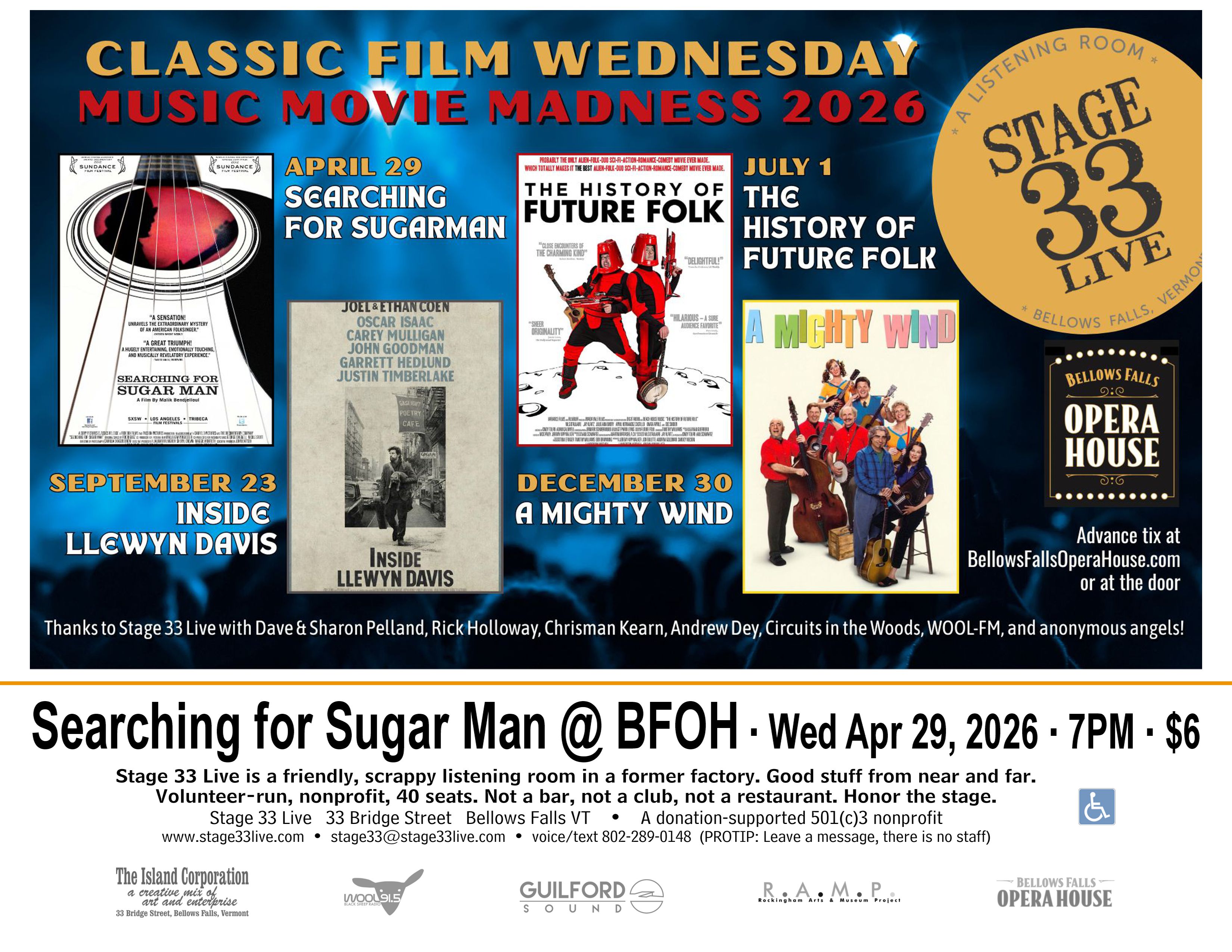 Stage 33 Live, along with Dave & Sharon Pelland, Rick Holloway, Chrisman Kearn, Andrew Dey, Circuits in the Woods, WOOL-FM, anonymous angels, and Rockingham Entertainment Development are sponsoring four classic movies at the Bellows Falls Opera House this year. Tickets are $6 in advance through bellowsfallsoperahouse.com or at the Opera House box office on show day.