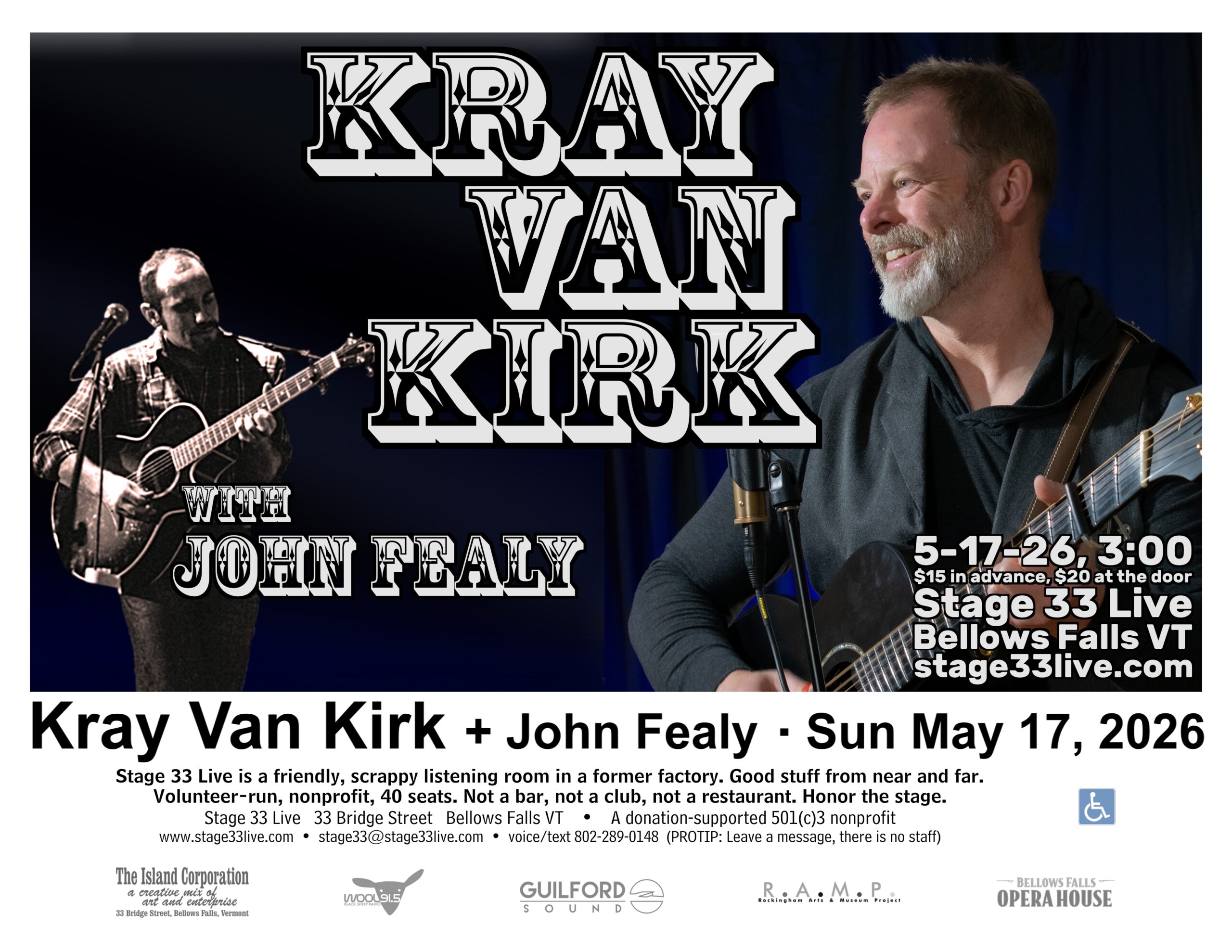 Kray Van Kirk with John Fealy at Stage 33 Live in Bellows Falls, Vermont, on May 17, 2026 in a 3:00 matinee. Tickets are $15 in advance through stage33live.com, or $20 at the door as available. Advance tickets guarantee entry. Only 40 tickets will be sold.
