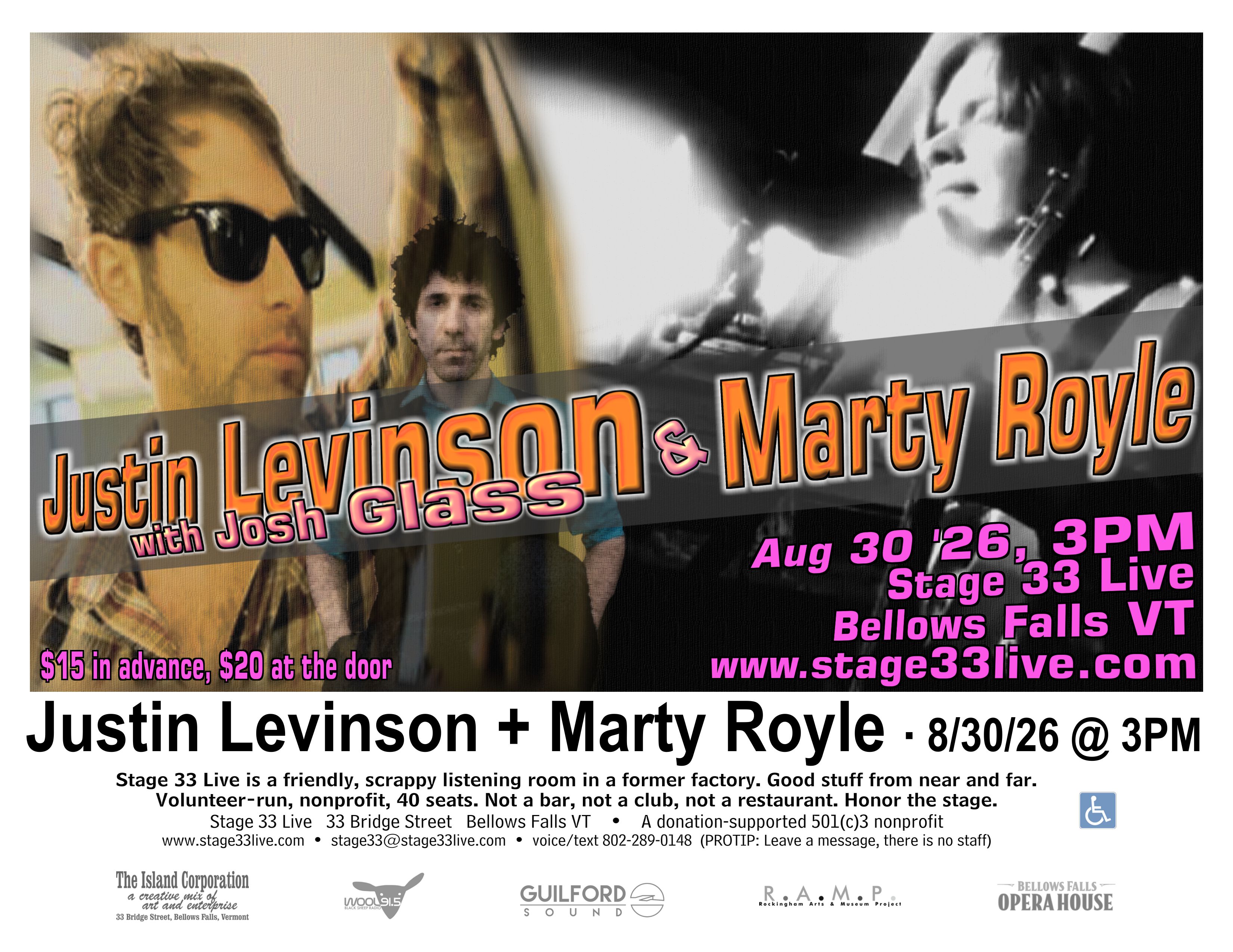 Stage 33 Live gratefully acknowledges the help of so many individuals without whom none of this would be able to happen, and institutional support this season from The Island Corporation, WOOL-FM, Guilford Sound, and the Rockingham Arts & Museum Project to help fund improvements and maintenance, and generally smooth out a lot of the rough edges. Stage 33 Live is a 501(c)3 nonprofit organization, and all donations are deductible to the fullest extent. Volunteers run the thing from stem to stern.