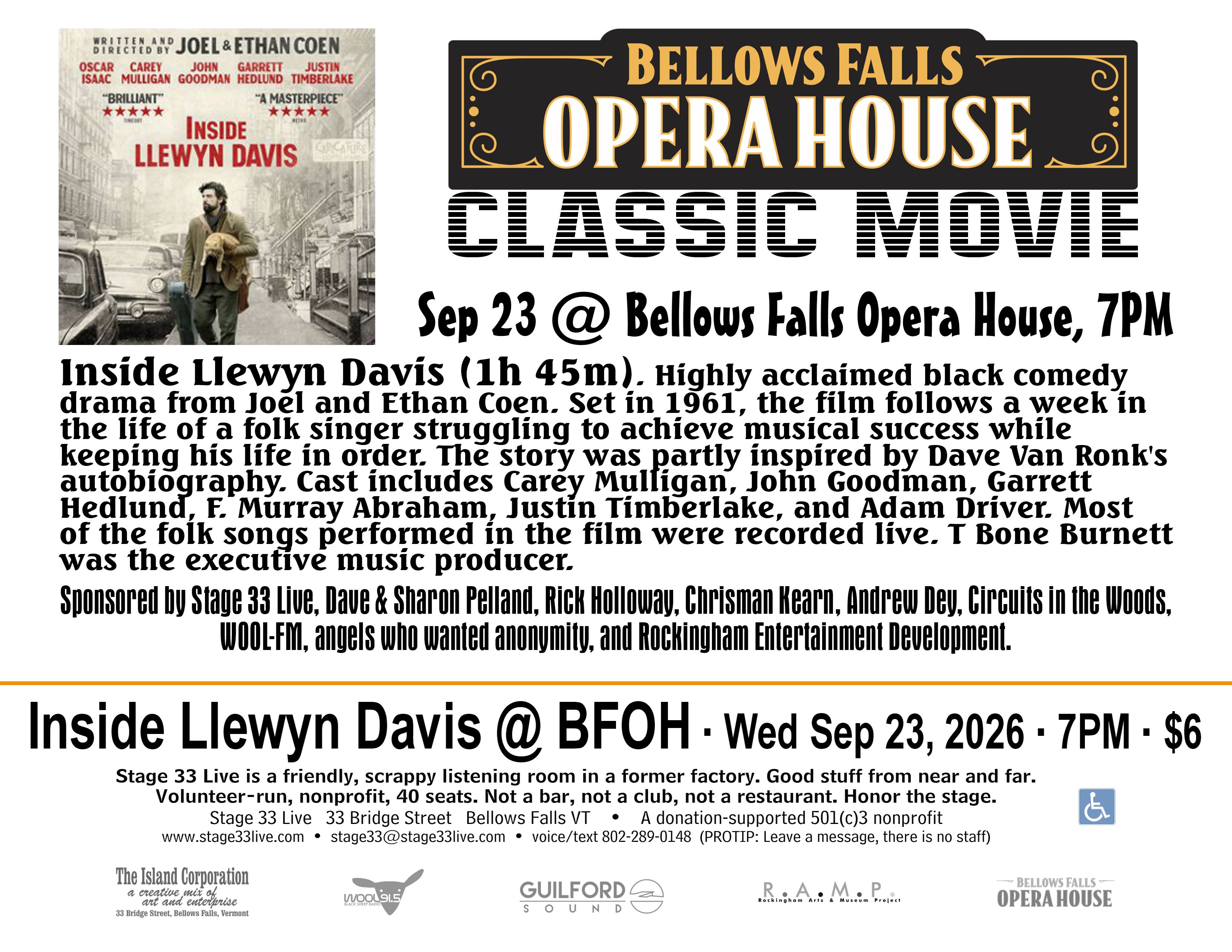 Stage 33 Live, along with Dave & Sharon Pelland, Rick Holloway, Chrisman Kearn, Andrew Dey, Circuits in the Woods, WOOL-FM, anonymous angels, and Rockingham Entertainment Development are sponsoring four classic movies at the Bellows Falls Opera House this year. Tickets are $6 in advance through bellowsfallsoperahouse.com or at the Opera House box office on show day.