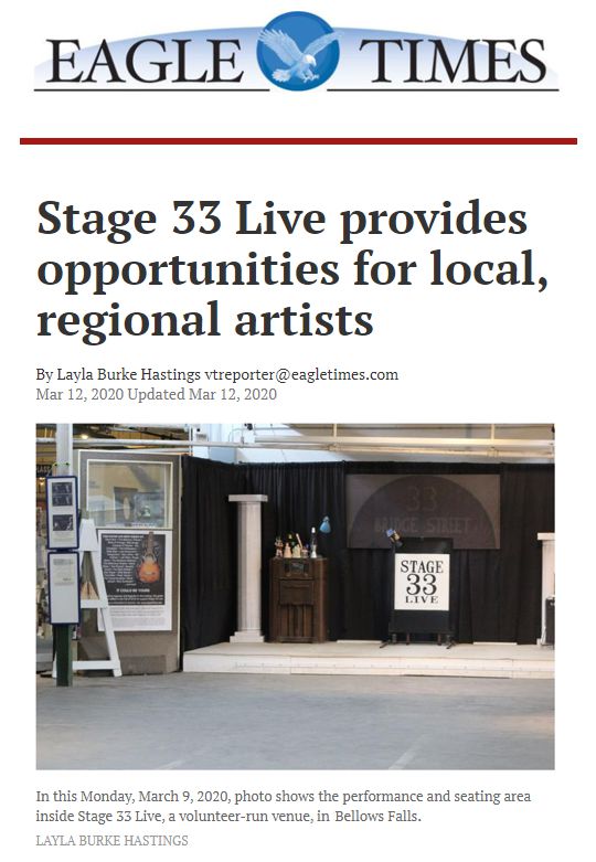 Layla Burke Hastings wrote a great feature story about us for the Eagle Times: “Stage 33 Live provides opportunities for local, regional artists.” It was published literally two days before our first Covid-nixed show more than a year ago. We’re pasting it here with some light edits for accuracy and to bring it up to date, and we’ve also added annotations.