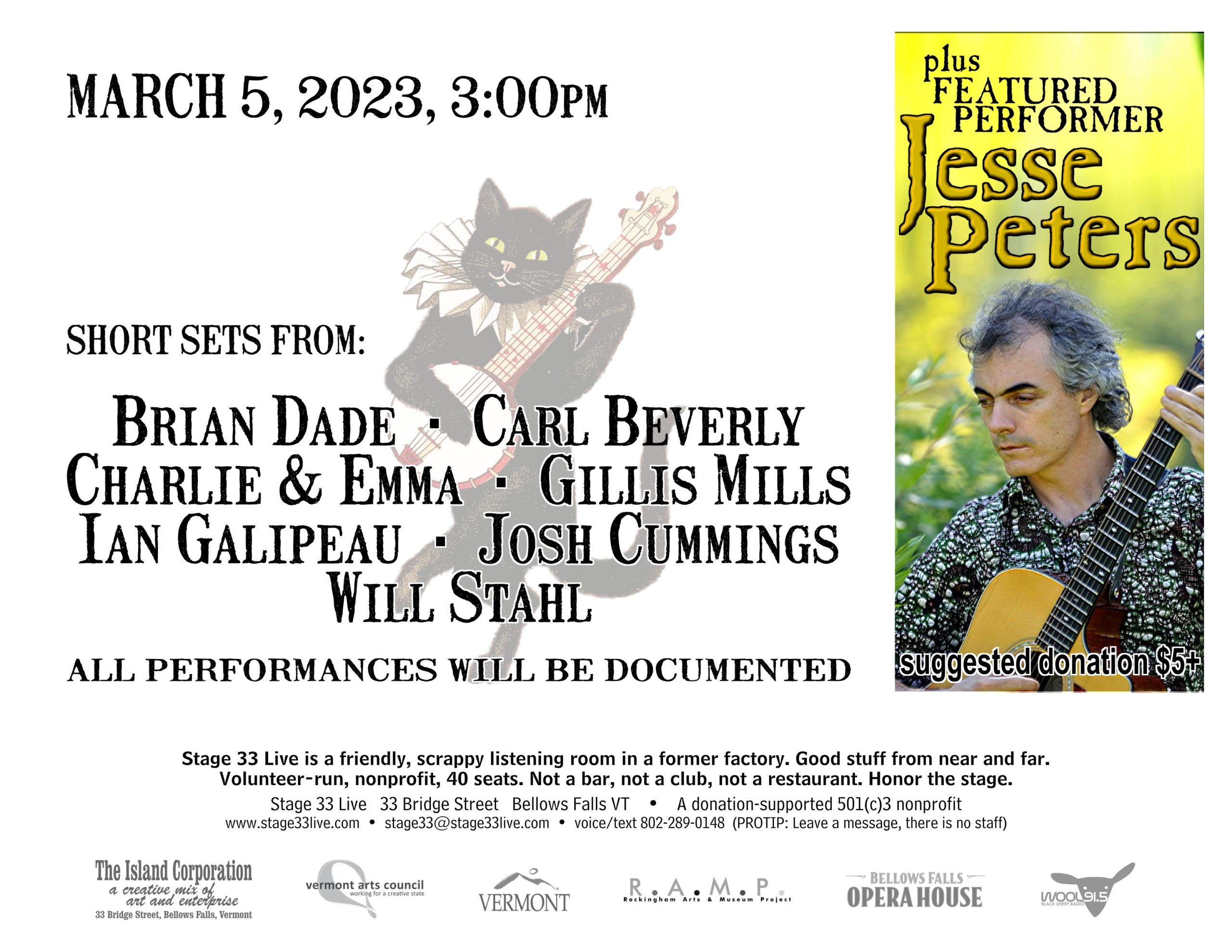 BELLOWS FALLS — Jesse Peters will play a full set following micro-performances by local and regional performers Brian Dade, Carl Beverly, Charlie & Emma, Gillis Mills, Ian Galipeau, Josh Cummings, and Will Stahl (performance order to be determined). A 3:00 PM matinee at Stage 33 Live, 33 Bridge Street in Bellows Falls VT on Sunday, March 5, 2023. Suggested $5+ donation at the door, no advance tickets. Limited seating; performances are recorded and filmed.